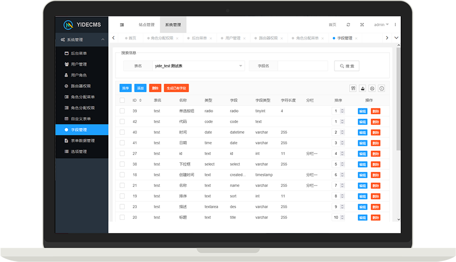 • 表字段管理 支持表的字段添加、修改、删除操作功能。