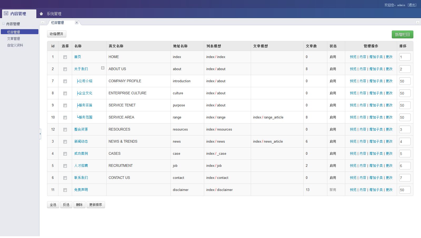 • 菜单管理 做为辅助栏目url管理的功能,可用可不用。
